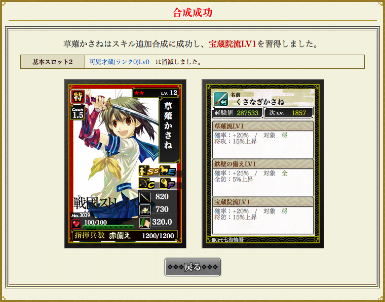 先日の記事で銅銭とられてスキルレベル上げる余裕がないと書きましたが、このかさねへの合成が原因です。
