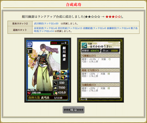 ★3Lv19まで上げました。Lv20にしてもいいのですが、今期のうちにランクアップ素材を用意できそうにないのでここで終了でもいいかと^^ ★4や★5剣豪をもってる人たちは変態です。